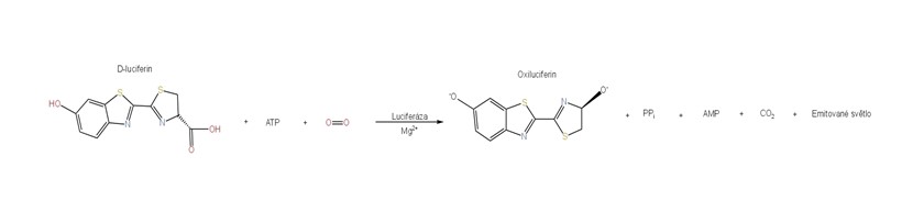 V obrázku č. 3 je zobrazena chemická reakce D-luciferinu s enzymem luciferáza v přítomnosti kyslíku, ATP a hořečnatého kationtu. Produkty jsou oxiluciferin, pyrofosfát (PPi), adenosinmonofosfát (AMP), oxid uhličitý a ovšem studené světlo, které je důvodem bioluminiscence.